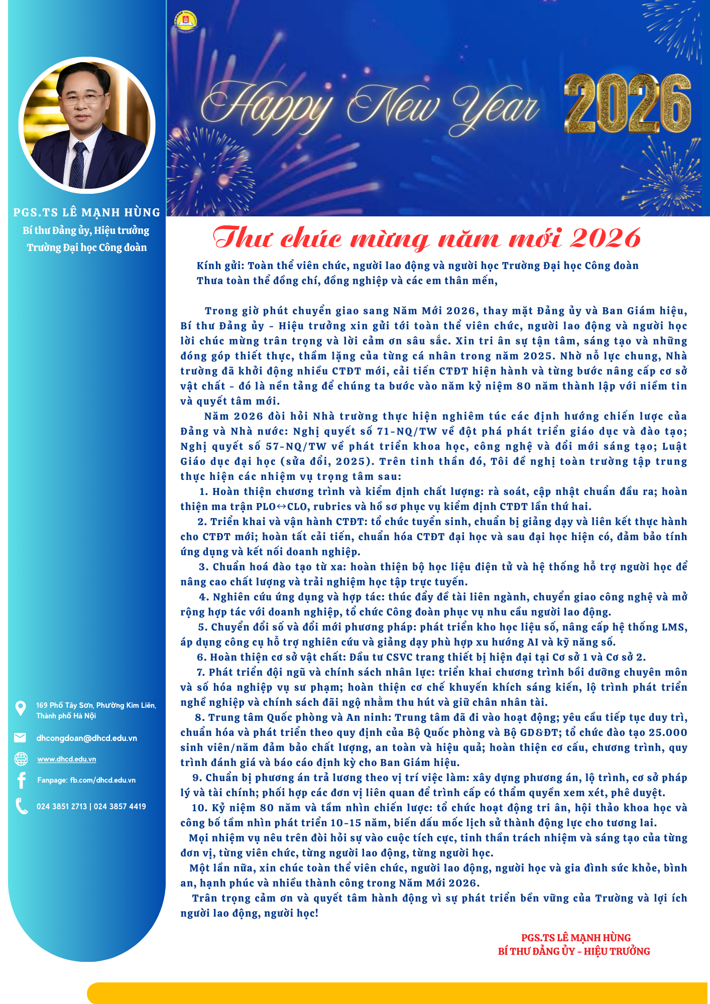 THƯ CHÚC MỪNG NĂM MỚI 2026 CỦA HIỆU TRƯỞNG TRƯỜNG ĐẠI HỌC CÔNG ĐOÀN