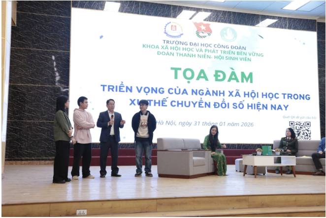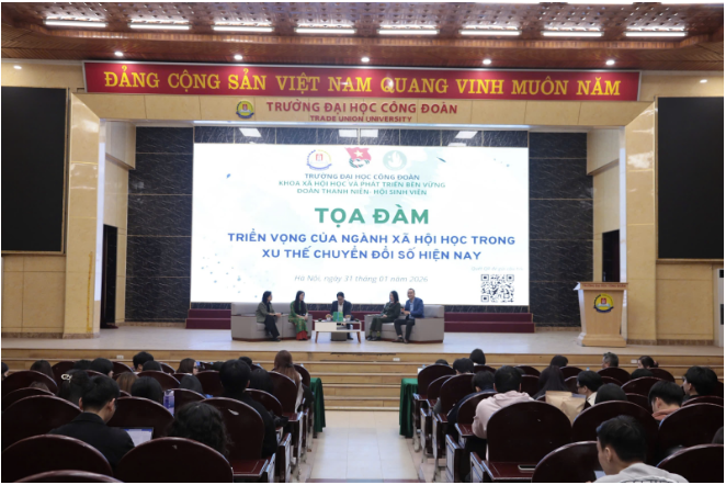 Ngày 31/01/2026, tại Trường Đại học Công đoàn, Khoa Xã hội học và Phát triển bền vững đã phối hợp với Đoàn Thanh niên - Hội sinh viên tổ chức Tọa đàm "Triển vọng của ngành Xã hội học trong xu thế chuyển đổi số hiện nay". Tọa đàm là không gian trao đổi học thuật và định hướng nghề nghiệp dành cho sinh viên Khoa Xã hội học trong bối cảnh số hóa mạnh mẽ hiện nay. Chương trình có sự tham gia của các chuyên gia, nhà khoa học giàu kinh nghiệm đến từ các viện nghiên cứu, trường đại học và tổ chức phi chính phủ. Tọa đàm mang đến những góc nhìn cập nhật, đa chiều về cơ hội, thách thức và kỹ năng cần thiết của người làm Xã hội học trong kỷ nguyên số.