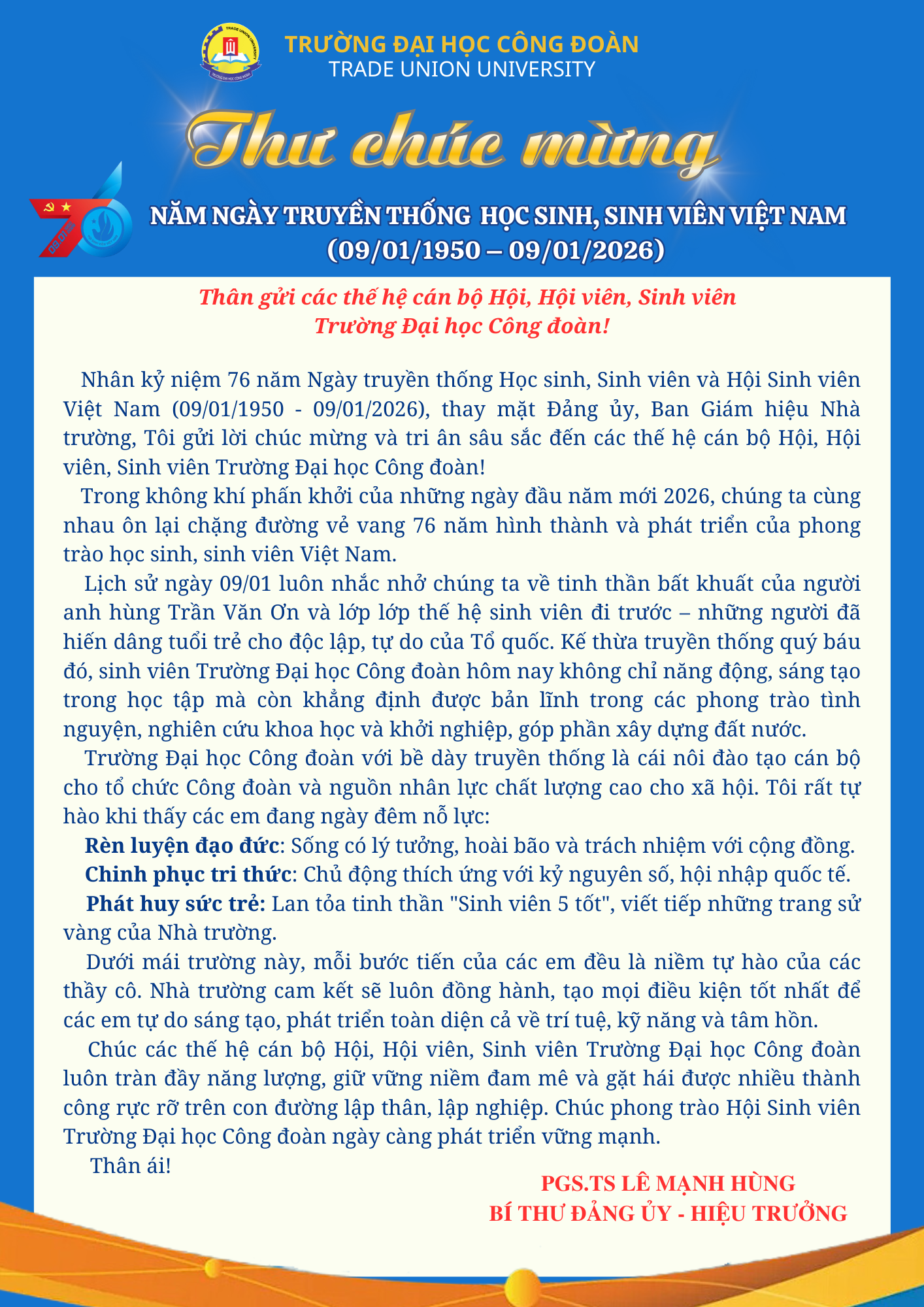 THƯ CHÚC MỪNG NHÂN DỊP KỶ NIỆM 76 NĂM NGÀY TRUYỀN THỐNG HỌC SINH, SINH VIÊN VIỆT NAM CỦA HIỆU TRƯỞNG TRƯỜNG ĐẠI HỌC CÔNG ĐOÀN